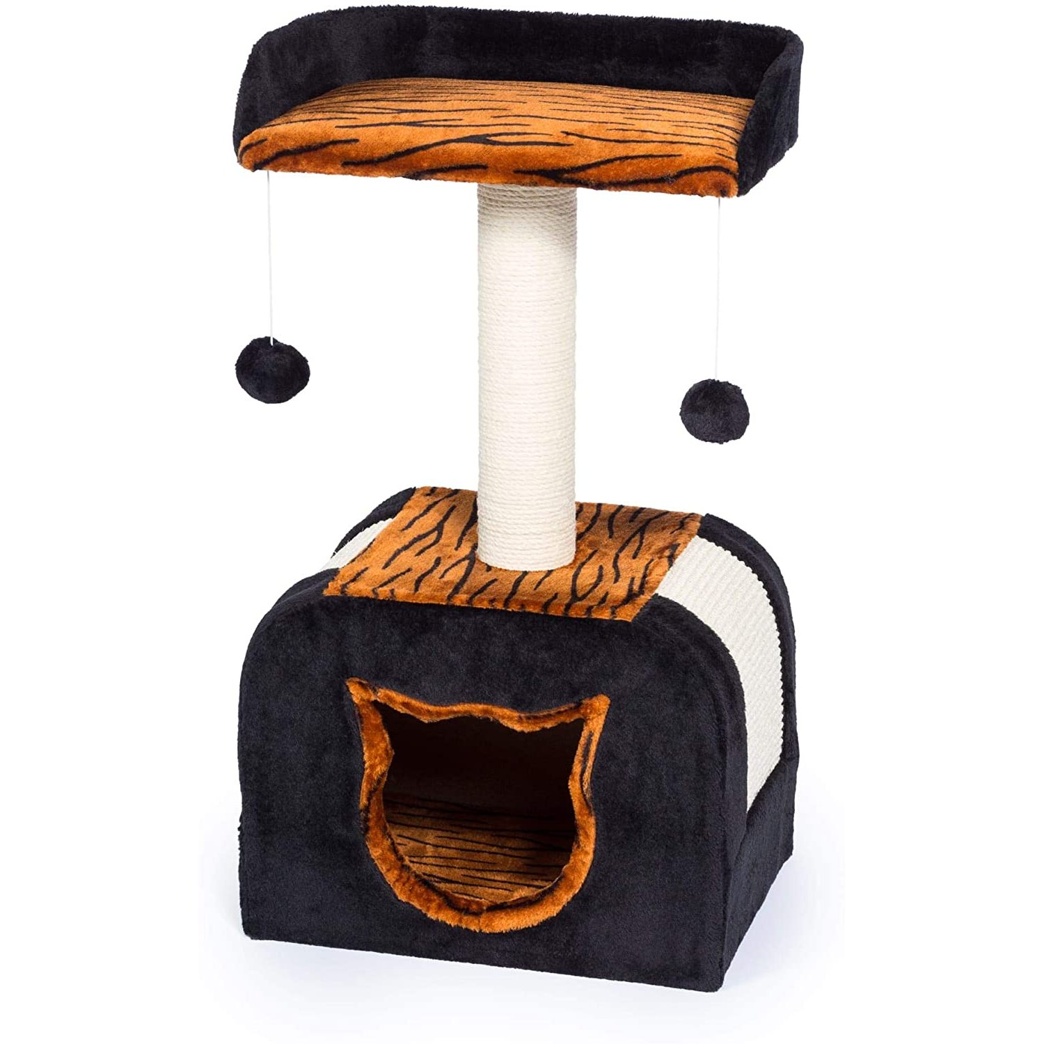 Prevue Pet Products Kitty Power Paws Tiger Hideaway 7305 combines super soft, plush fabrics with durable jute and natural sisal to provide the perfect place for lounging, sleeping, scratching, hiding and playing. With its luxurious tiger pattern, the Tiger Hideaway cat tree features a cushy, day bed with a "U" shaped back, making your cat or kitten feel more secure and less vulnerable to sneak attacks. A natural jute scratching post plus sisal scratching panels offer an appealing texture to cats, curbing inappropriate scratching behaviors and saving your sofa. Two plush, dangling, swat toys hang playfully from the cat bed providing opportunities for pouncing, jumping and play. The sturdy base contains a kitty shaped entryway leading to the covered hideaway where your cat or kitten will feel more secure and avoid social stress. Expertly designed cat furniture assembles easily and satisfies the needs of cats of all ages, sizes and activity levels. Measures 16" Long, 12" Wide and 29" High.