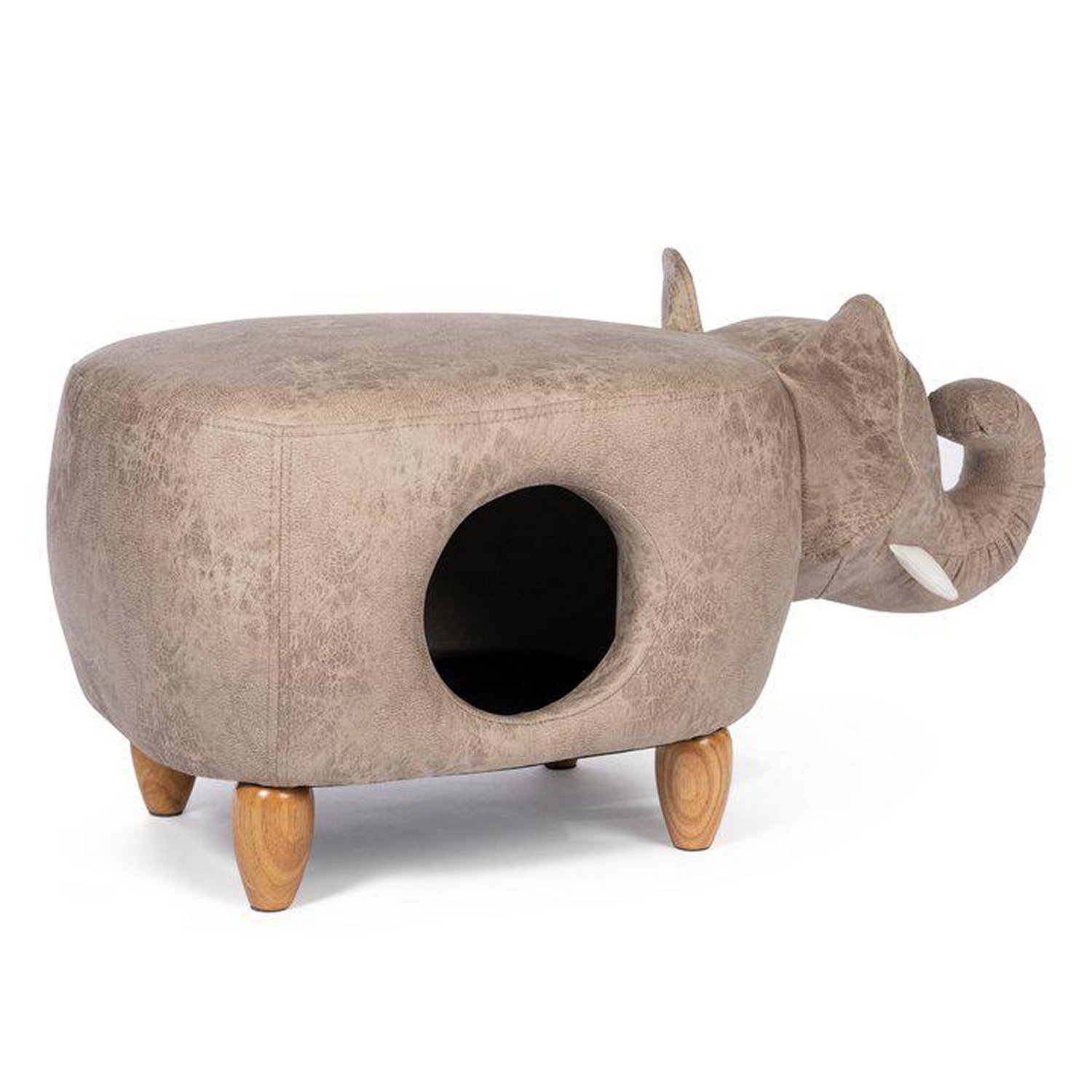 Prevue Pet Products Elephant Ottoman 7390 allows you to spend quality time with your cat or small dog. Footstool features a fun and cozy hideout for your cat, kitten or small dog plus ample space to kick up your feet, let your pet lounge on top, or both! This sturdy hassock makes the perfect companion to any comfy chair and adds a touch of whimsy to any room. The luxurious gray faux-leather, polyester fabric and solid pinewood legs complement your home décor. Prevue Pet Products Gray Elephant Ottoman 7390 measures 35” Long from the back to the tip of the trunk, 18” Wide and 16” High with a hideaway opening 7 1/2’’ in diameter. For indoor use only.